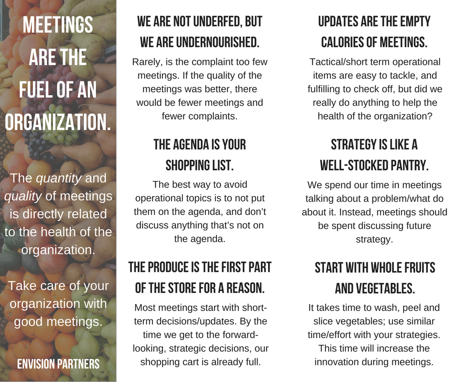 Updates are the empty calories of meetings. Tactical/short term operational items are like potato chips—you can’t eat just one. These items are easy to tackle, and fulfilling to check off, giving the feeling that we’ve really accomplished something–that is, until we get to the bottom of the bag and realize it wasn’t all that useful. Did we really do anything to help the health of the organization?